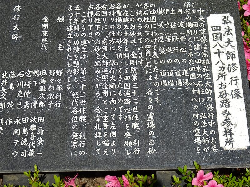 左手に修行大師像を囲んで四国八十八ヶ所のお砂踏み霊場がある、四方の石柱に阿波(発心)・土佐(修行)・伊予(菩提)・讃岐(涅槃)の霊場と刻され、石柱の下に札所の砂が収められている。お砂を踏みながら、「南無大師遍照金」と唱えて一まわりすると四国遍路をめぐったことになるという。