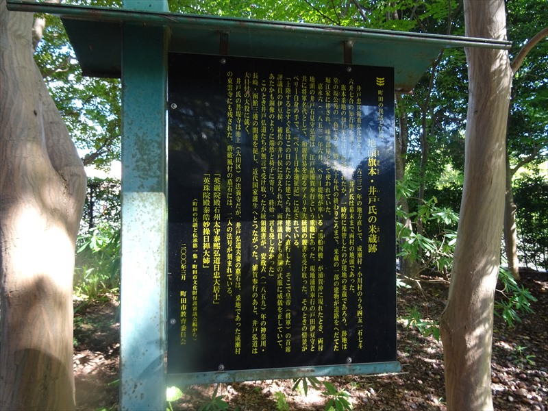 井戸忠兵衛重弘は寛永十年(1633)年の地方直しで成瀬村・小川村のうち四五一石七斗六升七合の知行地を賜った。以後、井戸氏は幕末まで両村の地頭であった。 旗本采地の地行米は江戸に運ばれたが、一時的に保管したのが現地の米蔵であろう。跡地は堂之坂公苑の一角である。昭和40年代の終わり頃まで米蔵の一部の建物が道路をへだてた堀江家に移され味噌部屋として使われていた。・・( 堂之坂公苑内にある説明板より抜粋)