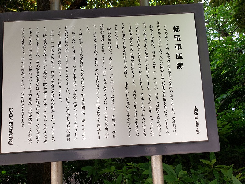 明治通りの天現寺橋の交差点からすぐの所にあります。縦に長い形をした公園ですが、この辺りは都電の広尾電車営業所の車庫があった所です。都電は交通渋滞の原因となったことから次々に撤去されていったそうで、公園入口にひっそり都電車庫跡の説明版があります。