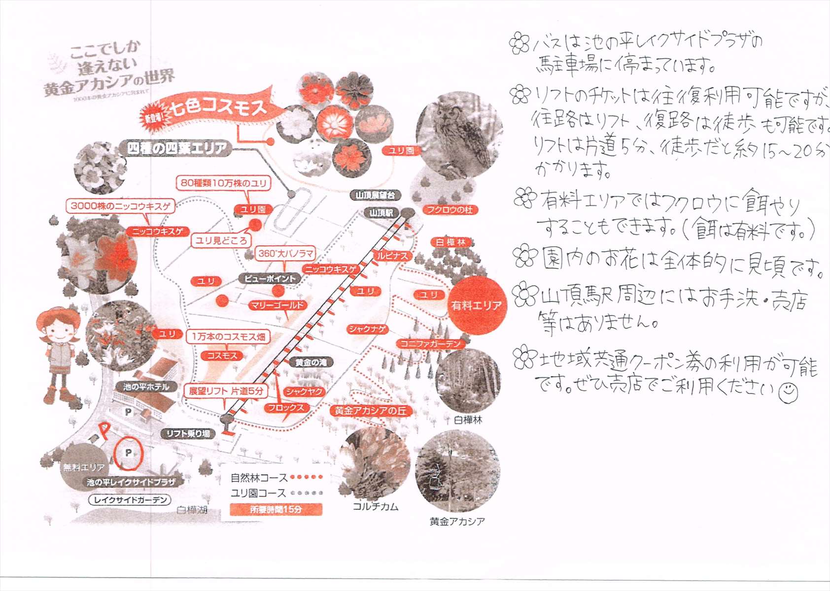 白樺湖、秋になると一面が黄金色に染まるアカシアの郷(コスモス、往路はリフトでらくらく山頂駅へ復路は黄金に輝くアカシアやリフト下のコルチカム、チョコレートコスモスを観賞しながら下ります)。白樺湖を背景に望む約1000本の群生は息を呑む美しさです。東山魁夷の絵画作品モチーフとして有名な「御射鹿池」(絵画のモデルとして有名な神秘の池)や会員制リゾートホテル御射鹿池エクシブ蓼科での、本格イタリアンのコースランチもお楽しみに。