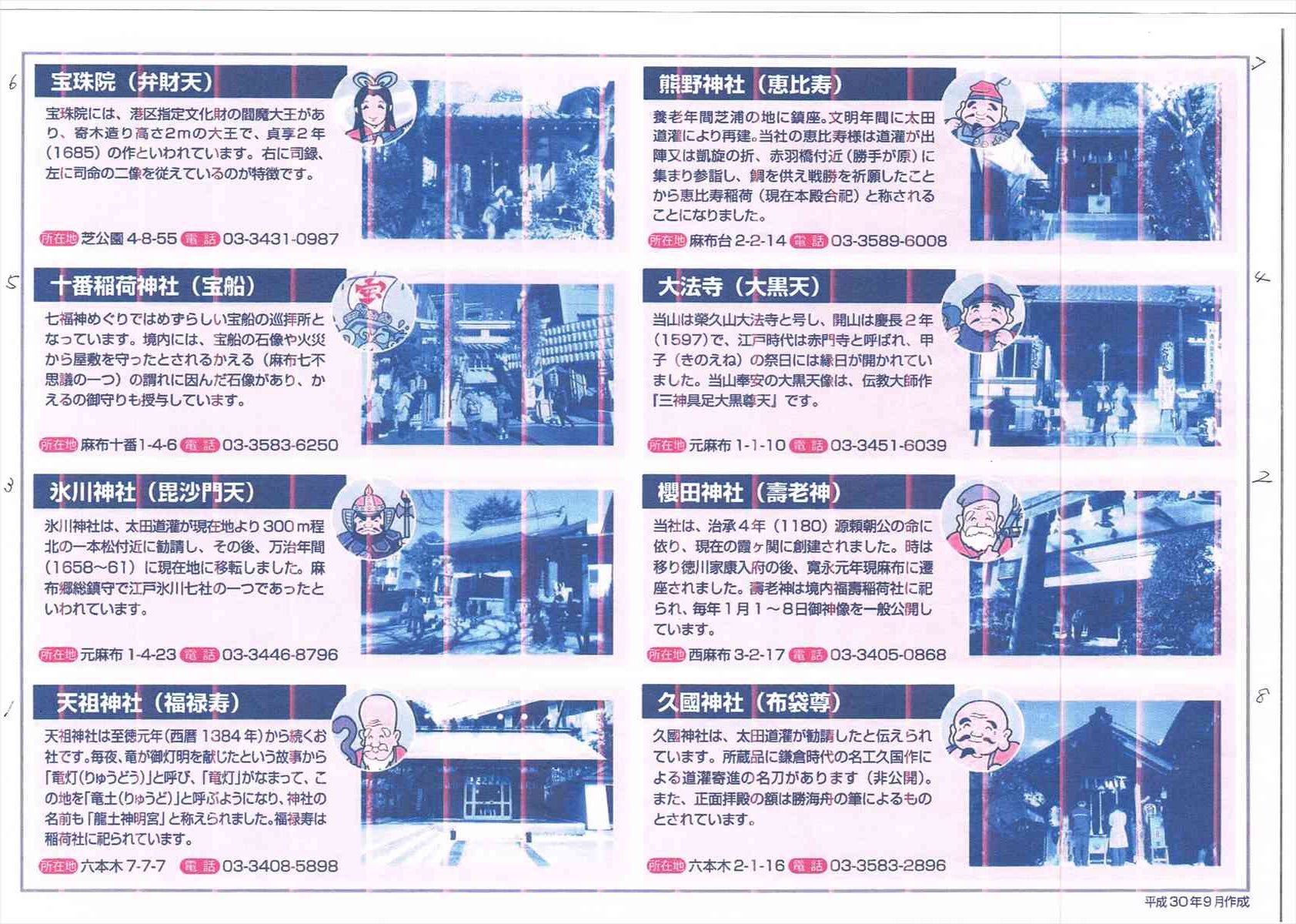 都営大江戸線赤羽橋→宝珠院(弁財天)→熊野神社(恵比寿)→久國神社(布袋尊)→天祖神社(福禄寿)→櫻田神社(寿老人)→氷川神社(毘沙門天)→大法寺(大黒天)→十番稲荷神社(宝船)→都営大江戸線麻布十番駅