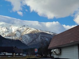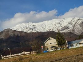 栂池は軒下にかき集めた雪があるくらいでしたが、スキー;の人達で駐車場はいっぱいでした。