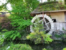 湯川沿いに下ると水車小屋 水車小屋隣のあずまや休憩