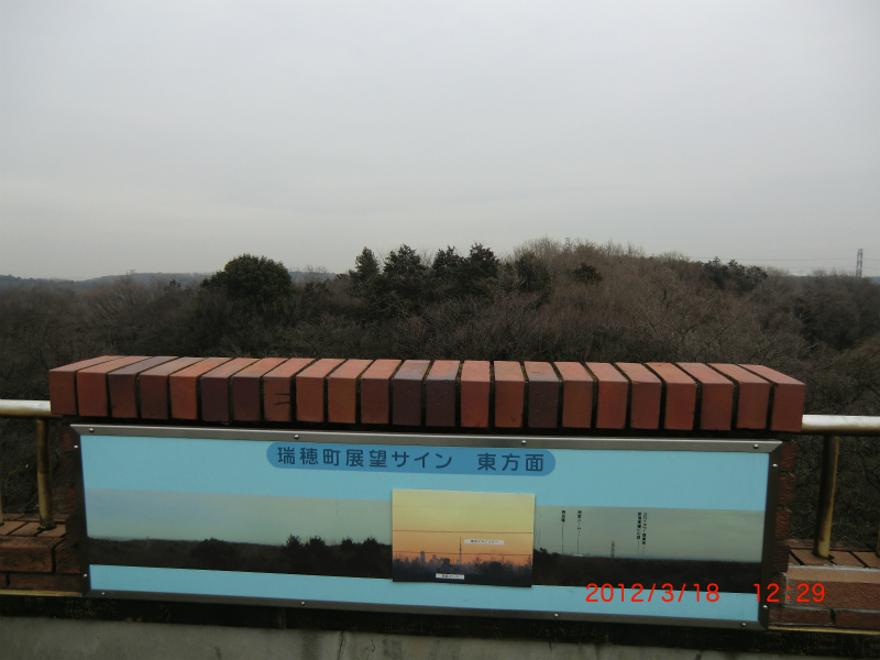 瑞穂ビューパーク展望塔は工事中のため入れなかった、お伊勢山遊歩道は、瑞穂中・瑞穂農芸高を右下に見ながら東北に向かうと一等三角点の頂上につく。更に北東に辿ると高根集落に下りる。此処にトイレ水場のある高根山休憩所園地がある。此処から又高根山遊歩道を登り返すと、狭山掛橋ひろ橋着く、此処はビューパークから直接来られる場所だ、此処までは車道が上がってきている、車道を分けて遊歩道を進む、下った所に、榎にしっかり体を預けた庚申塔がある、むかし道を示す由緒看板の有り、新しく整備された道路に、出会の辻の標識、まもなく広い芝生園地に着く。六道山公園、展望台・トイレが有る。昼食をここですれば良い。帰りは尾引山遊歩道を南にたどる、途中2ヶ所左に里に下る標識を通り越し3つ目の標識を左にたどり阿豆佐味天神社の裏につく。この各遊歩道は最近整備され、案内標識も新しく里歩きには最適です。