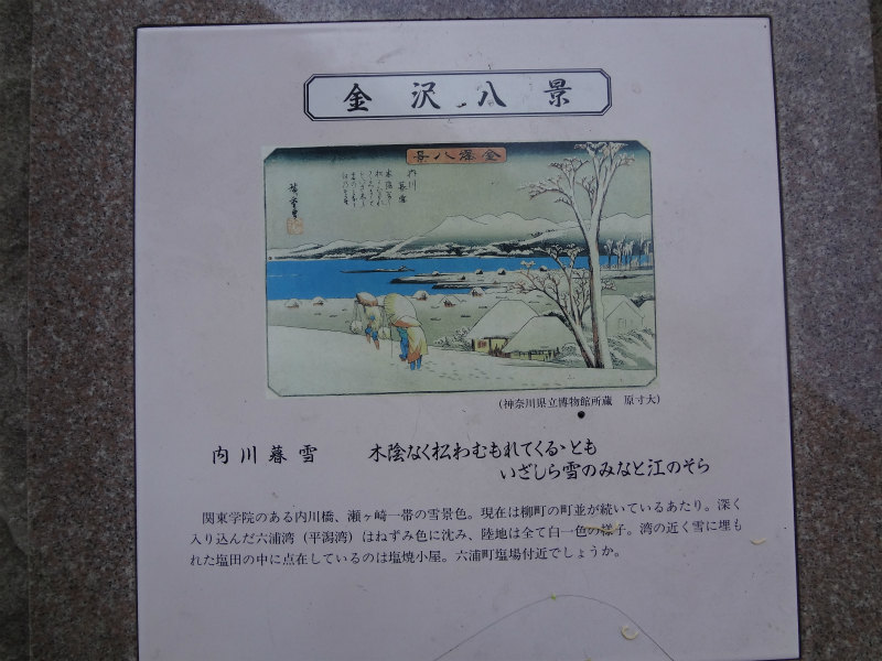 京浜急行金沢八景10時集合(京浜急行品川駅9:06発快速急行三崎口行乗車=金沢八景駅9:46着→瀬戸神社9:56→琵琶島神社→六浦川→金沢八景公園→平潟橋(侍従川)→野島公園→平潟湾(夕照橋)10:38→稲荷神社→野島公園(展望台)11:13→伊藤博文記念館11:40→野島橋→金沢漁港→海の公園(人口砂浜)→生物観察地区13:18→金沢八景大橋→八景島(シーパラダイス)→丘の広場14:04→八景島大橋→芝生広場→称名寺前通り→セブンイレブン左折→赤門通り→君ケ崎→谷津公園15:10→京浜急行金沢文庫駅15:16
