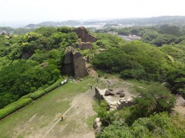 階段上から追浜方面 垂直に空に伸びる石の切り出し跡