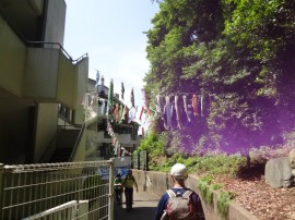 川を渡り左に行くと駄菓子屋が有る5分程で左に川に合わす。第3公園から長い石段をショートカットも可能